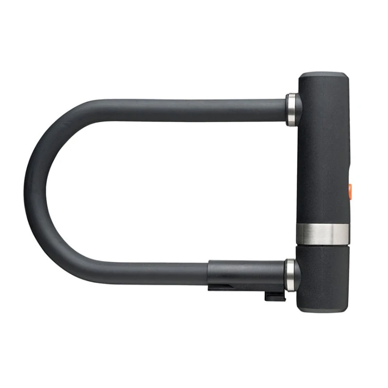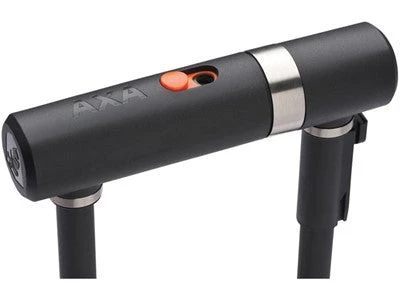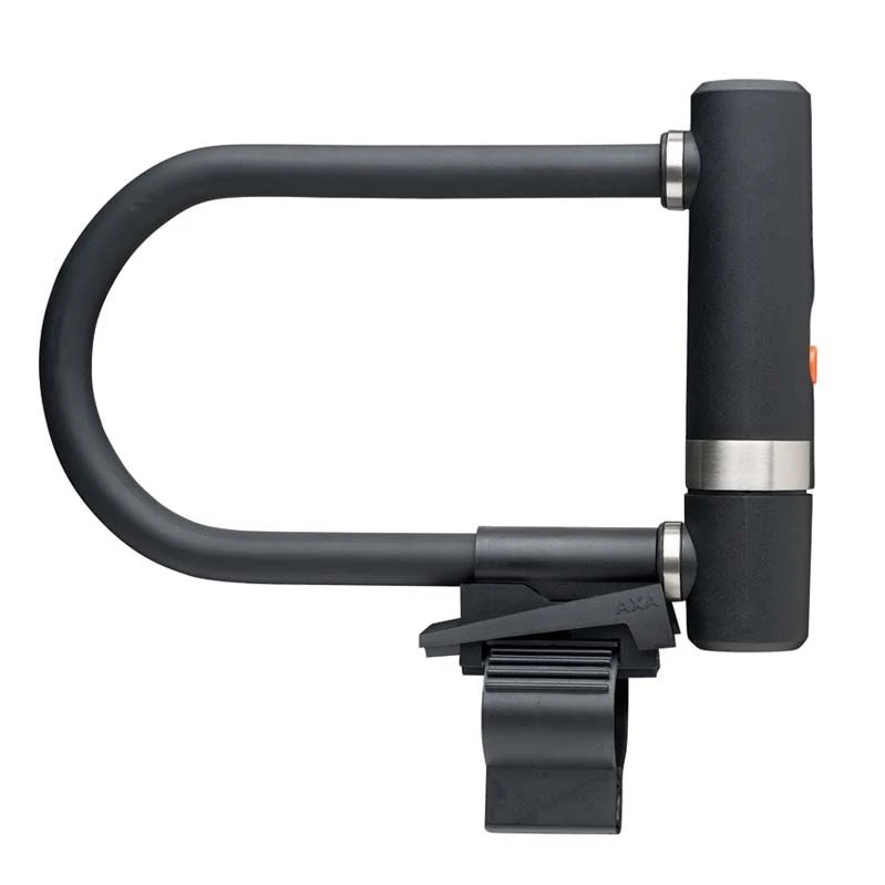 Karkaistusta teräksestä valmistettu moderni AXAn U-lukko. Ruostumattomasta teräksestä valmistetut yksityiskohdat.