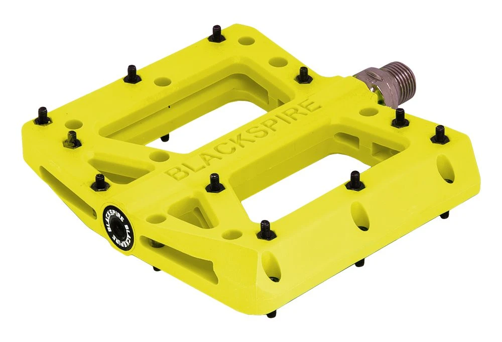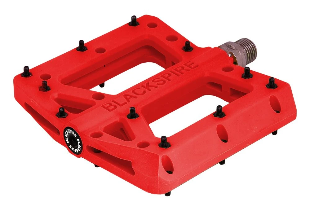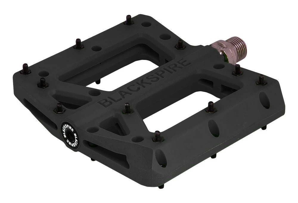 Laadukkaat ja tukevat nyloniset flat-polkimet vaihdettavilla ja säädettävillä piikeillä. CNC-koneistettu CrMo-akseli. Concave malli,reuna piikit ylempänä kuin akseli. Laadukkaat suojatut laakerit. Paino: 430gr. pari Koko: 116x105mm