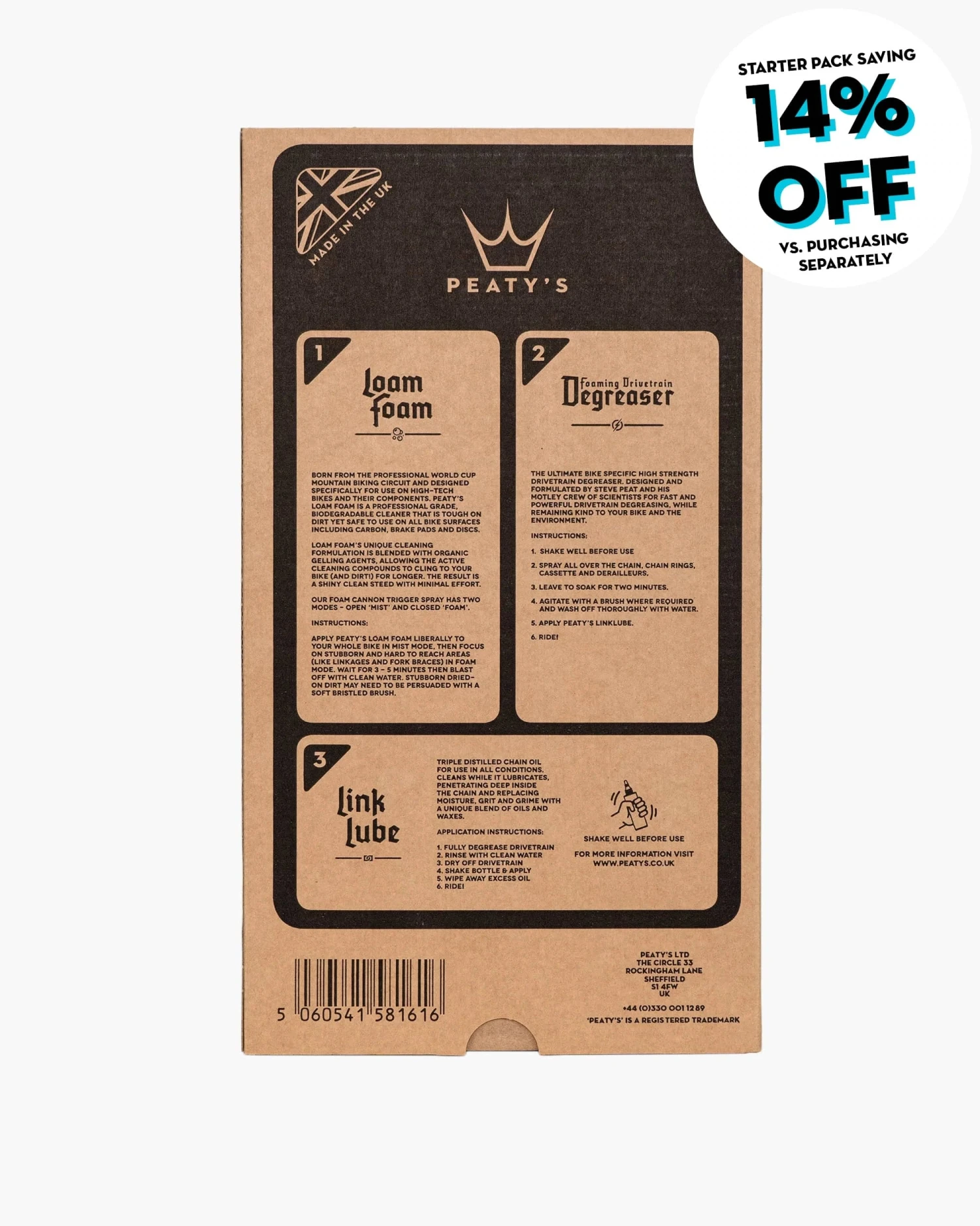 Pakkaus on päällystämätöntä (ei kiiltäviä polymeeripinnoitteita) ja valmistettu vähintään 70 % kierrätysmateriaalista. Jonkin verran uusiomateriaalia tarvitaan aina, jotta paperit saavat lujuutta. Pakkaus on FSC-sertifioitu, mikä tarkoittaa, että kaikki uusiomateriaalit on hankittu kestävistä ja hoidetuista metsistä. Peaty’s käyttää vain yhtä mustaa painatusta, jotta kierrätys olisi mahdollisimman helppoa sen jälkeen, kun se on hävitetty.