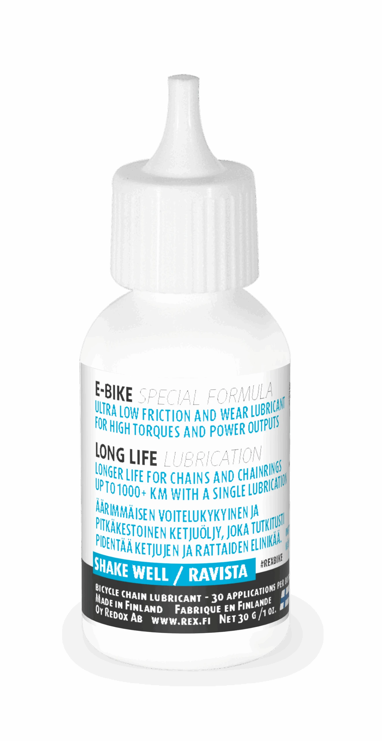 Sähköpyörissä ketjut ja rattaat altistuvat tavallista suuremmille voimille. Pienet rataskoot, matala kadenssi ja suuri teho ovat yhdistelmä, joka kuluttaa ketjut ja rattaat vaihtokuntoon nopeasti. Rex Black Diamond E-Bike ketjuöljy jopa kuusinkertaistaa sähköpyörän ketjun käyttöiän!